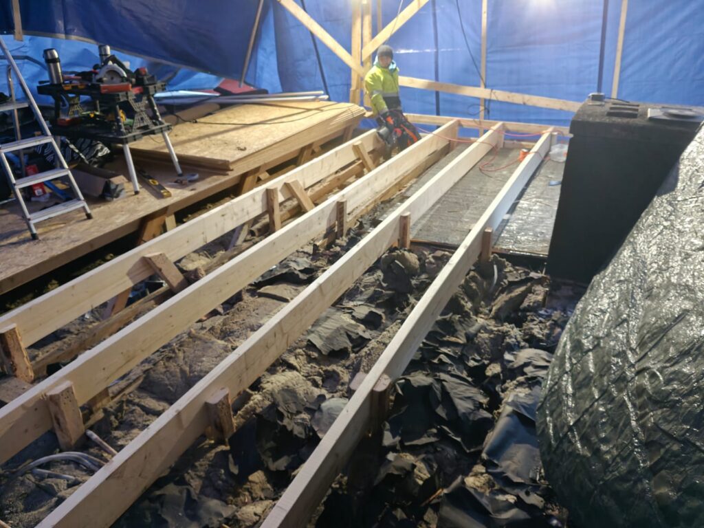Korjaustyöt voidaan toteuttaa kaikkina vuodenaikoina. Käytämme työmaalla jatkuvasti etenevää, vesitiivistä ja lämpöeristettyä suojatelttaa, jonka alla kattorakenteet puretaan ja rakennetaan kattoalue kerrallaan.